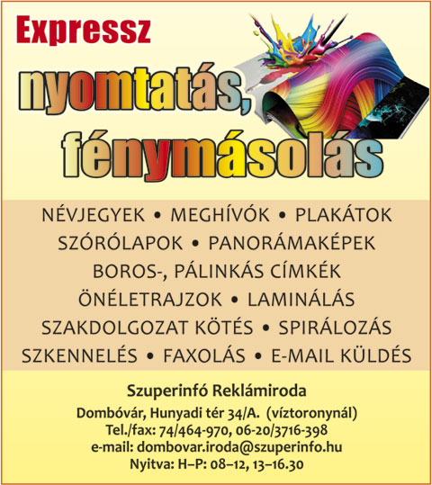 • Hirdetésfelvétel: Szuperinfó, Infodombovar.hu, Infotamasi.hu
